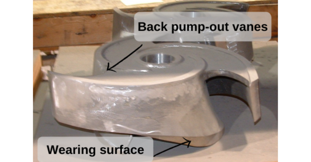 然而,隨著葉輪向吸入耐磨板的方向調(diào)整,葉輪后面的間隙會增加。大多數(shù)開式葉輪在非泵送側(cè)都有小葉片,稱為“背抽葉片”。這些葉片就像另一個離心泵一樣,其目的是保持填料函的低壓。如果沒有這些葉片,填料函壓力將接近泵的排放壓力,這可能導(dǎo)致填料污染和填料壽命降低。