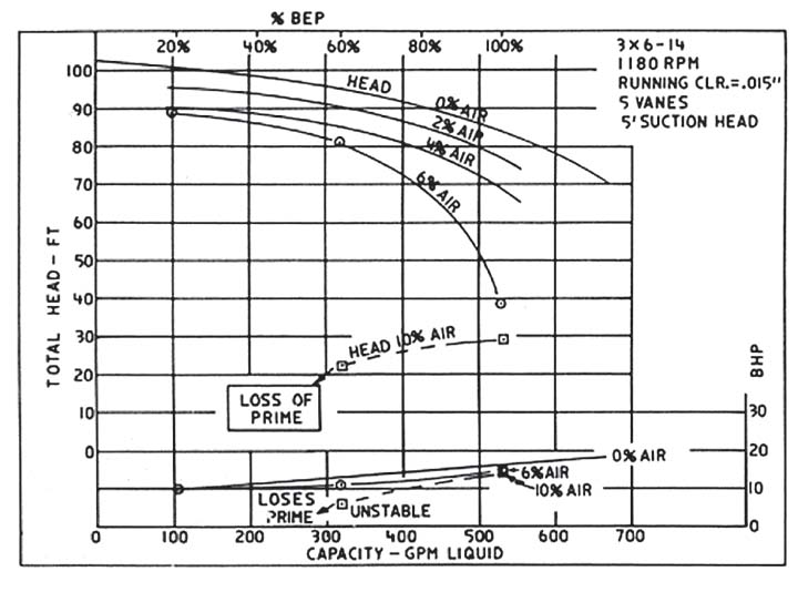 標(biāo)準(zhǔn)離心泵設(shè)計(jì)可用于高達(dá) 4% 體積的夾帶氣體。對(duì)于 4% 以上的氣體夾帶值,可以有效地使用特別改進(jìn)的葉輪。