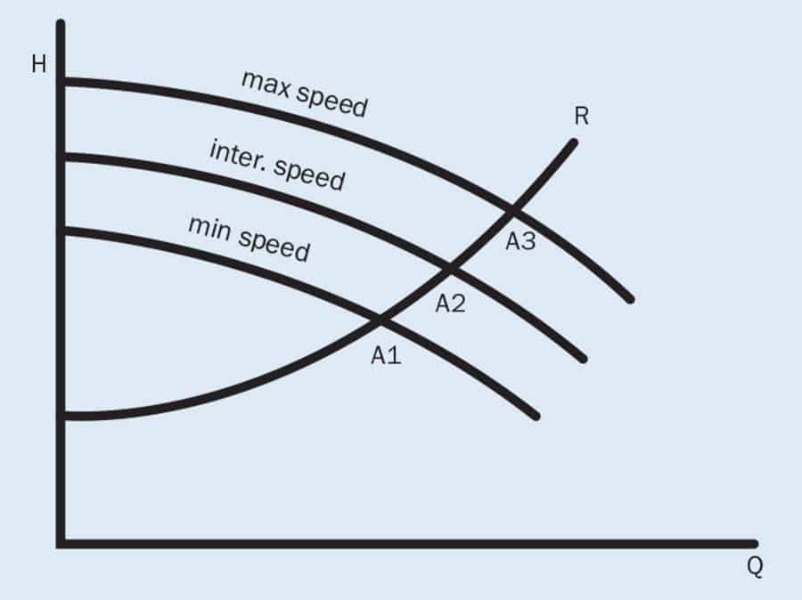改變泵的速度會改變泵的性能曲線。這會改變與系統(tǒng)阻力曲線的交點,從而導致流量發(fā)生變化。如下圖所示。