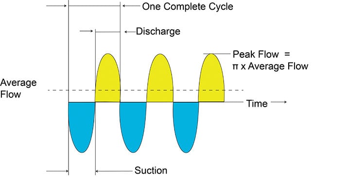 1. 泵送動作是由往復(fù)動作發(fā)展而來的。這種往復(fù)運(yùn)動產(chǎn)生流動正弦波。實際流量由圖 1 中的公式確定。