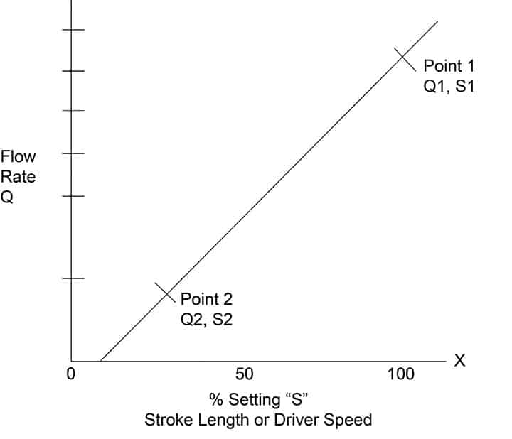 3、計量泵流量與沖程特性曲線呈線性關(guān)系(圖3)。然而,它不一定成比例,因為 50% 的沖程設(shè)置可能不等于 50% 的流量。這是因為校準(zhǔn)線可能不會同時通過兩個軸上的 0。通過在兩個沖程設(shè)置下測量流量,繪制兩個點并通過它們畫一條直線,可以準(zhǔn)確預(yù)測其他流量與沖程的關(guān)系。