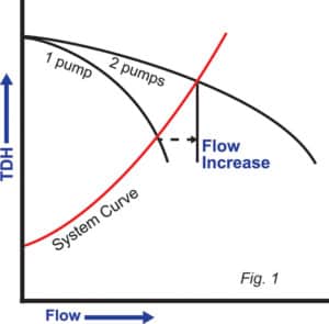 在任何給定的總動(dòng)態(tài)揚(yáng)程 (TDH) 下,并聯(lián)運(yùn)行的兩個(gè)相同的泵能夠產(chǎn)生兩倍于單個(gè)泵的流量。然而,系統(tǒng)中實(shí)現(xiàn)的實(shí)際流量取決于系統(tǒng)曲線與泵曲線的交點(diǎn)。除非系統(tǒng)曲線是可變的,否則流量增加可能不會(huì)那么顯著。