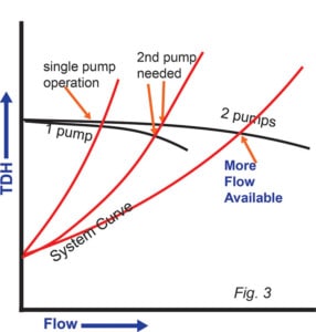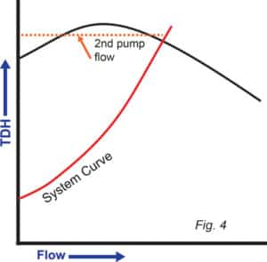 在圖 4 中,系統(tǒng)曲線和 TDH 曲線在大于關(guān)閉 TDH 值的 TDH 和低于曲線的最大 TDH 的 TDH 處相交。當(dāng)?shù)诙€(gè)泵啟動(dòng)時(shí),流量將僅增加到 TDH 與系統(tǒng)壓力匹配的第一個(gè)點(diǎn)。