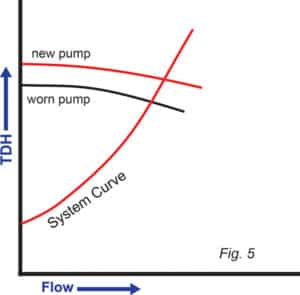 當(dāng)一個(gè)泵磨損時(shí),可能會(huì)出現(xiàn)類似的情況。這在圖 5 中有所提及。隨著泵的磨損,在任何給定流速下產(chǎn)生的 TDH 量都會(huì)減少。如果新泵與系統(tǒng)曲線的交點(diǎn)并聯(lián)在磨損泵的關(guān)閉TDH之上,它將迫使磨損泵進(jìn)入關(guān)閉狀態(tài)。