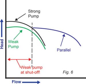 如果一個(gè)泵表現(xiàn)出較低的關(guān)閉 TDH 特性,它將在關(guān)閉狀態(tài)下運(yùn)行,直到主導(dǎo)泵在其曲線上移動(dòng)足夠遠(yuǎn),以至于其 TDH 低于具有較低揚(yáng)程的泵的關(guān)閉 TDH(圖 5 )。