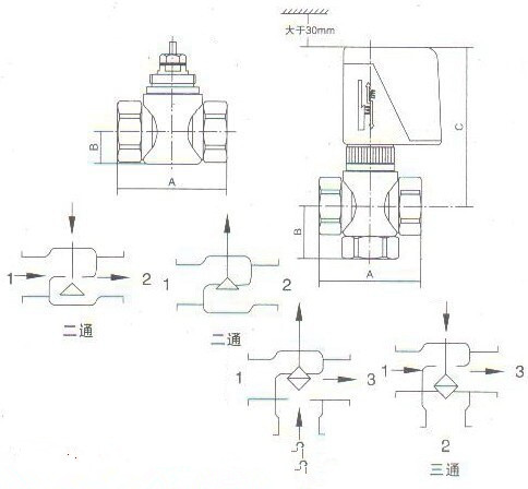 三、VA7010系列風(fēng)機盤管電動閥結(jié)構(gòu)、尺寸及安裝示意圖:
